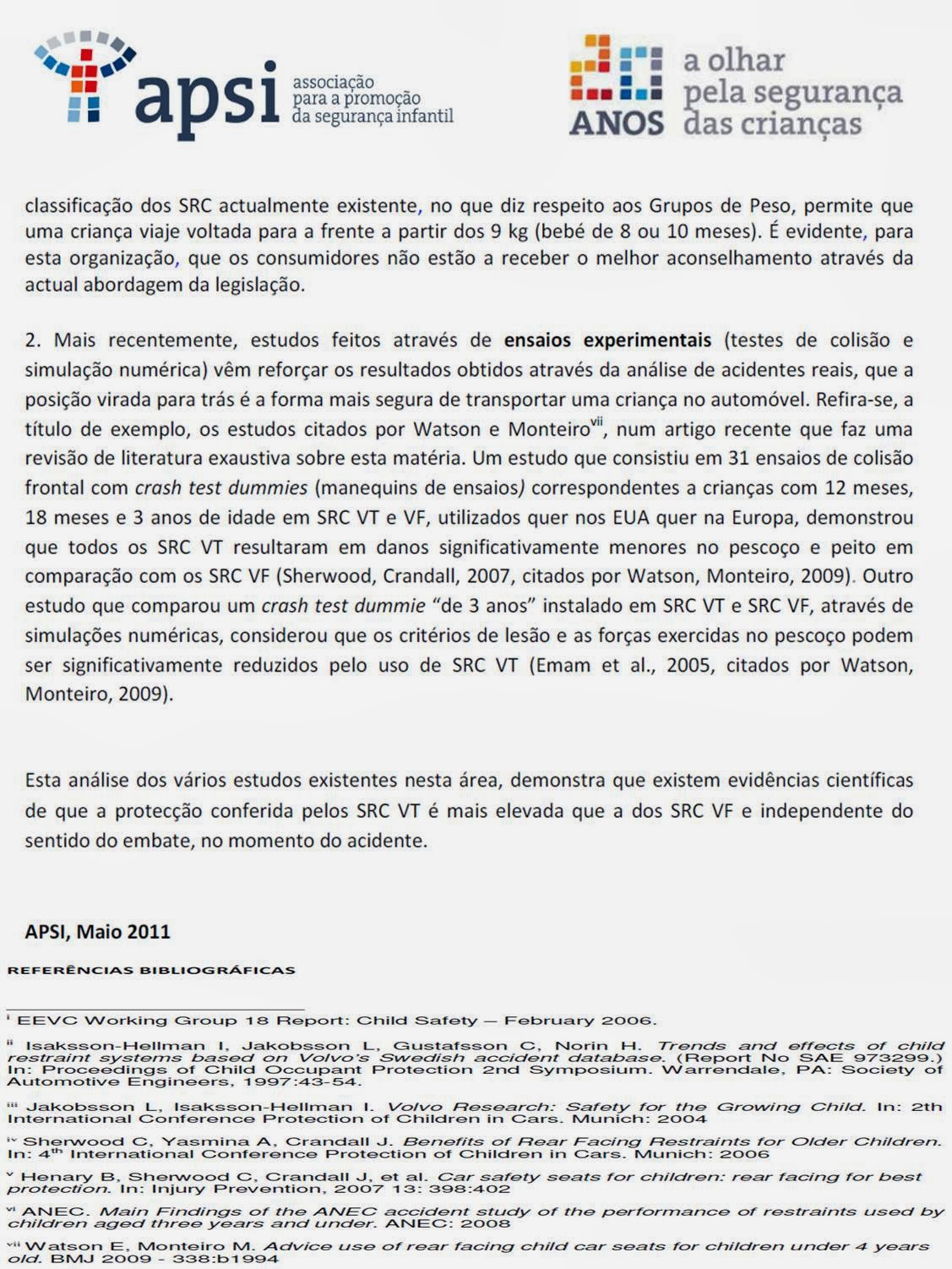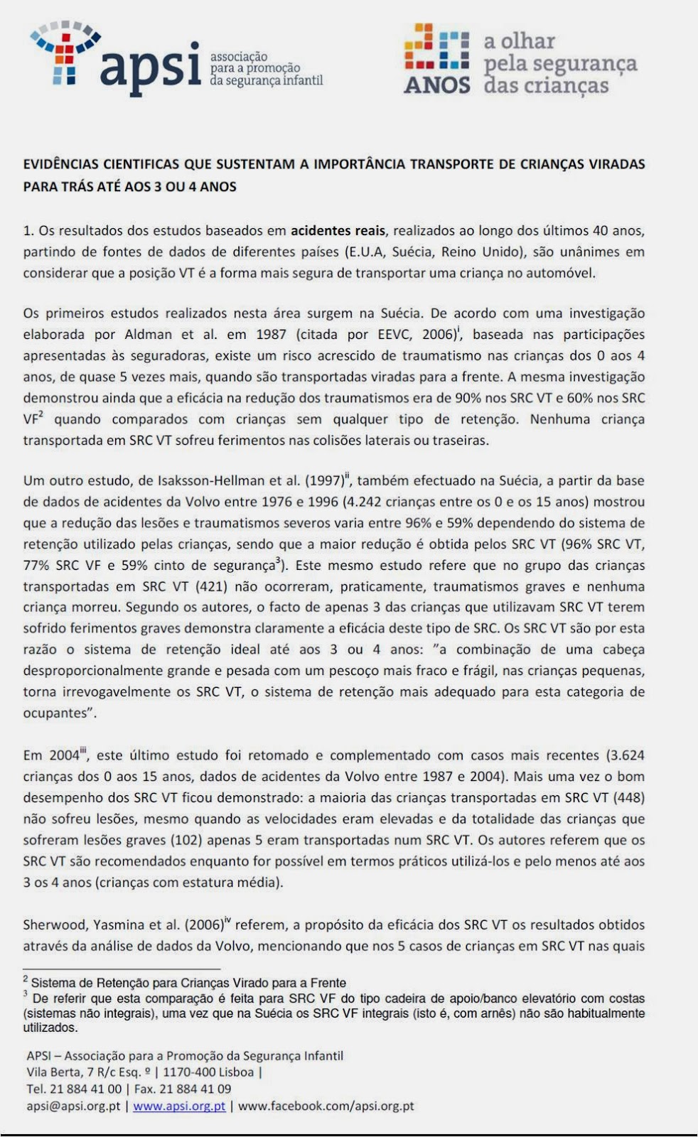 À semelhança do que acontece com outras entidades nacionais e internacionais (Direção Geral da Saúde, Sociedade Portuguesa de Pediatria, European Child Safety Alliance, ANEC – Consumidores Europeus, etc), a APSI recomenda que as crianças viajem em Sistemas de Retenção para Crianças (SRC) voltados para trás (VT) até o mais tarde possível – 3 ou 4 anos, mas pelo menos até aos 18 meses devem manter esta posição. A cabeça da criança até aos 4 anos é muito grande e pesada, comparativamente com o peso total do corpo (cerca de 25%, comparando com 6% no adulto), sendo por isso, esta a posição que confere maior proteção em caso de acidente, evitando lesões da coluna cervical, geralmente muito graves, que podem provocar a morte ou incapacidades permanentes. Poderá visitar o seguinte site: http://www.youtube.com/watch?v=sssIsceKd6U&feature=player_embedded - filme bastante simples e explícito que demonstra a posição da APSI nesta matéria. Anexamos ainda dois documentos com toda a fundamentação para o transporte virado para trás até aos 3 ou 4 anos e com um estudo internacional sobre o assunto.