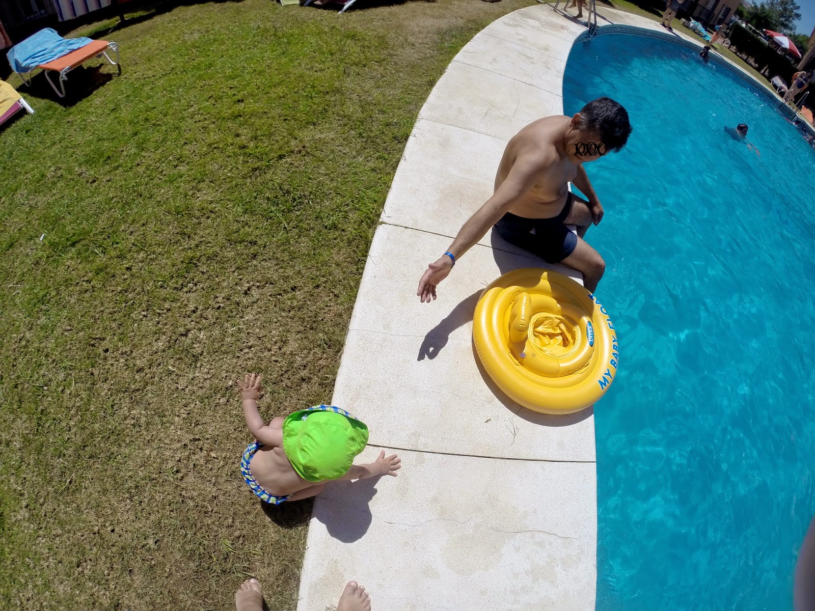 A piscina fazia os encantos do Diogo que era tirado da água sob protesto, quando começava a tremer mas... a piscina grande que dava para boiar, rodopiar, pular ao colinho da mamã, dar saltos no ar com o papá e ir ao repuxo fazer com que a força da água rodasse a bóia - acho que vamos ter um viciado em parque aquáticos!!!