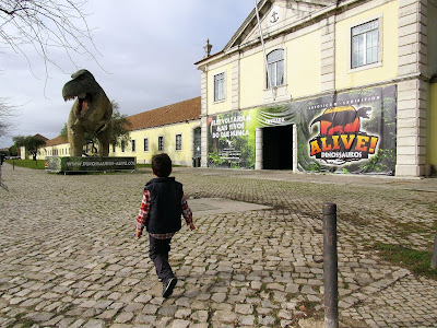 Para ver os dinossauros visitámos, já em Lisboa, o Dinossauros Alive mas não gostámos. O Diogo divertiu-se mas sinceramente aquilo é muito fraco. Como não posso mostrar as fotos devido ao impedimento da organização quem quiser ver pode contactar-me mas o que vão ver são alguns bonecos grandes, nem todos em tamanho real, com uma mecanismo no pescoço e alguns nas patas a mexerem, alguns fazem barulho e estão todos atrás de umas cercas tipo galinhas. Os corredores são escuros e pouco convidativos á observação pelas crianças porque as explicações são de difícil entendimento e extensas demais. As únicas coisas interessantes são o espectáculo dado pelas pessoas que vestem dinossauros porque as crianças têm oportunidade de tocar no dinossauros (que são do nosso tamanho) e no fim a máquina virtual de 3D (que é paga á parte) onde com os óculos fazemos uma mínima viagem de carro/barco ao Mundo dos Dinossauros.